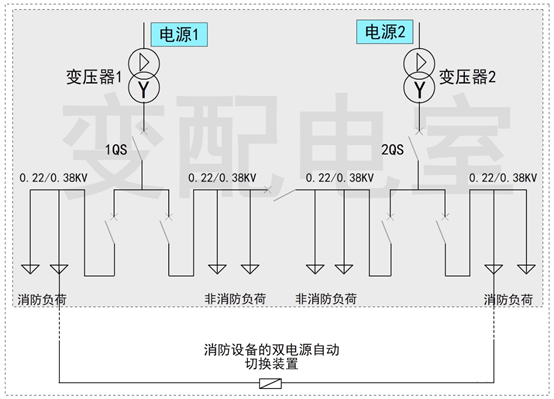 根据《建规》10.1.8要求:消防控制室、消防水泵房、防烟和排烟风机房的消防用电设备及消防电梯等的供电,应在其配电线路的末一级配电箱处设置自动切换装置。也就是说,这些设备均需要采用双回路供电的方式,在现场设置双电源自动切换装置(双电源切换柜),参见图示1: